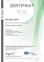 Im Bereich Handel mit Kraftfahrzeugen und Zubehör sowie Instandhaltung und Plege von Kraftfahrzeugen sind wir nach ISO 9001:2008 zertifiziert.